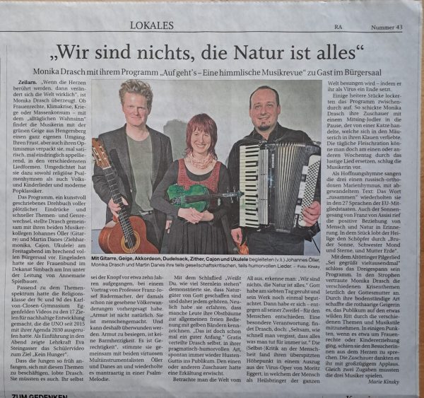 Musikalische Hoffnungsschimmer in diesen Wahnsinns-Zeiten: das verspricht ein neues Programm von Monika Drasch. Angesichts von Krisen, Krieg und anderen Katastrophen kommt die musikalische Grenzgängerin vom Bayerischen Wald diesmal mit einer launigen Zusammenstellung von Texten und Liedern zu den 17 Zielen für nachhaltige Entwicklung auf die Bühne, die die UN seit 2015 mit ihrer Agenda 2030 ausgerufen hat. Musikalisch garniert mit Anklängen an Kinder- und Kirchenlieder, aus Volksmusik, Klassik und Jazz streift sie von Klima und Konflikten über Umwelt und Naturschutz bis zum Weltfrieden und dem Miteinander der Völker. Immer wieder schimmert die Hoffnung durch, das sich die Welt zum Besseren hin entwickelt möge. Monika Drasch hat das Programm in den letzten Monaten zusammengestellt. Die Musik ist für sie das Medium, um Menschen auf der Herzebene zu erreichen. „Wenn die Herzen berührt werden, dann verändert sich die Welt wirklich,“ ist das musikalische Multitalent überzeugt.